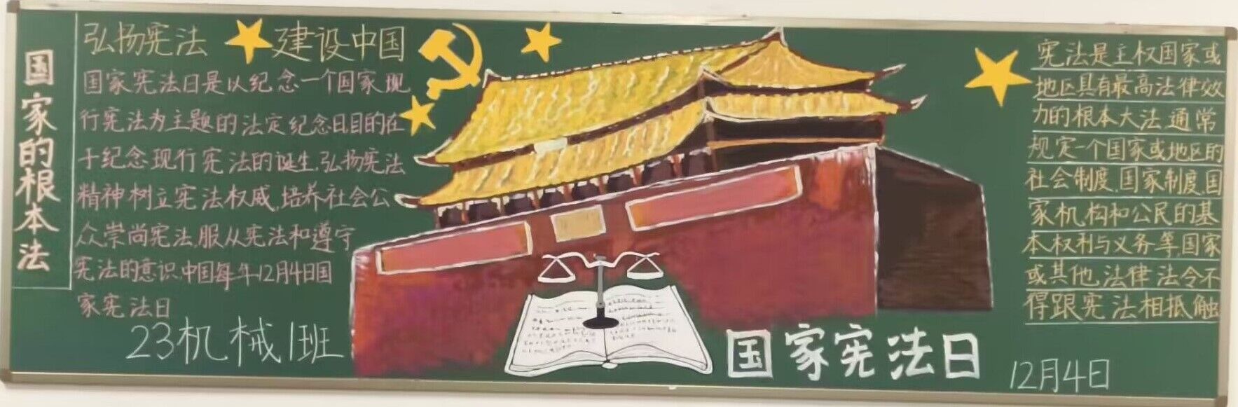 今年12月1日至12月7日为宪法宣传周活动时间,12月4日是第十个“国家宪法日”。为深入学习贯彻党的二十大精神,全面贯彻落实习近平法治思想和习近平文化思想,进一步弘扬宪法精神,维护宪法权威,增强学生的法治意识和遵纪守法的自觉性,买球体育官方网站举办了一场以“大力弘扬宪法精神,建设社会主义法治文化”为主题的黑板报线上评比活动。