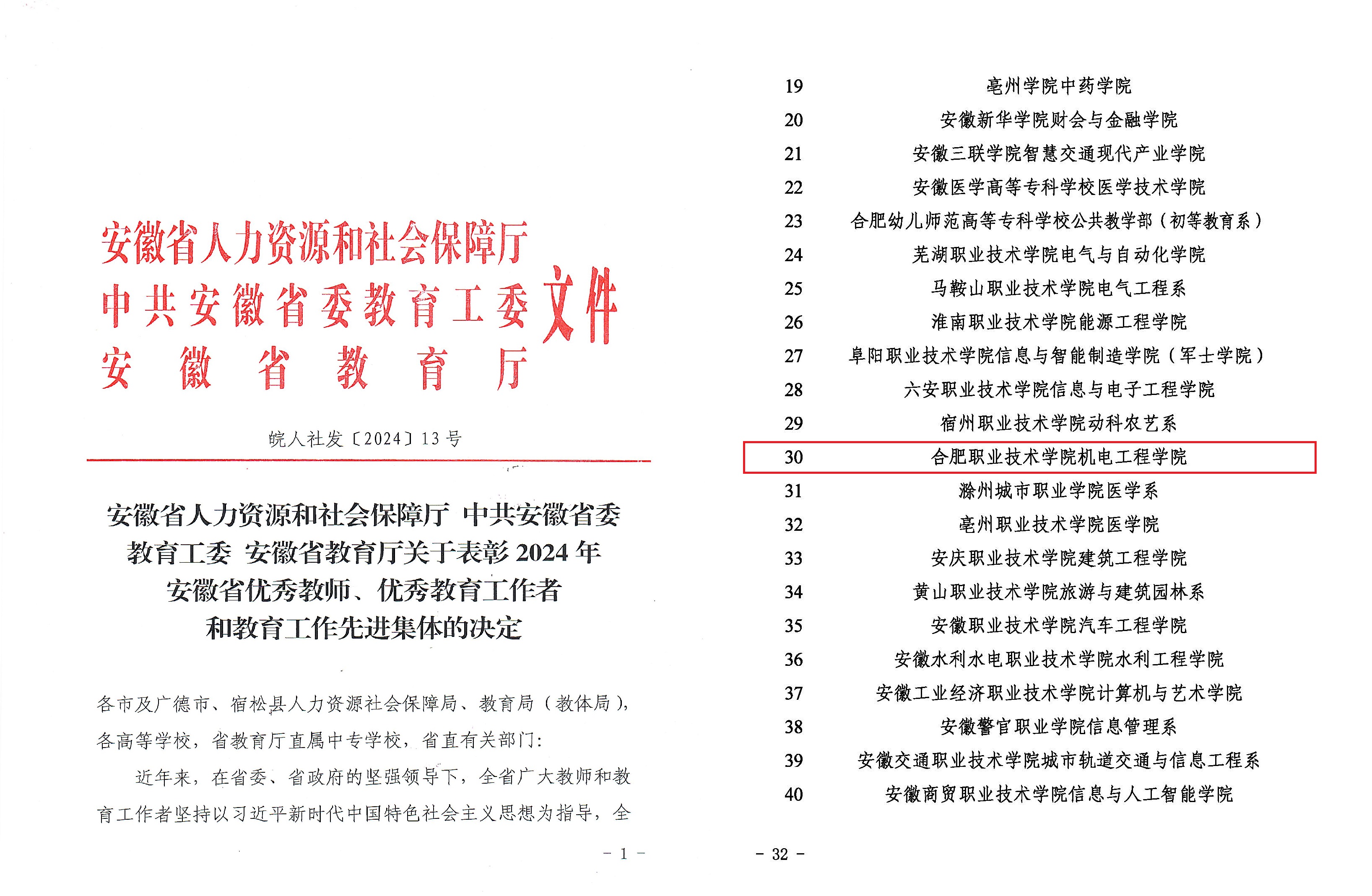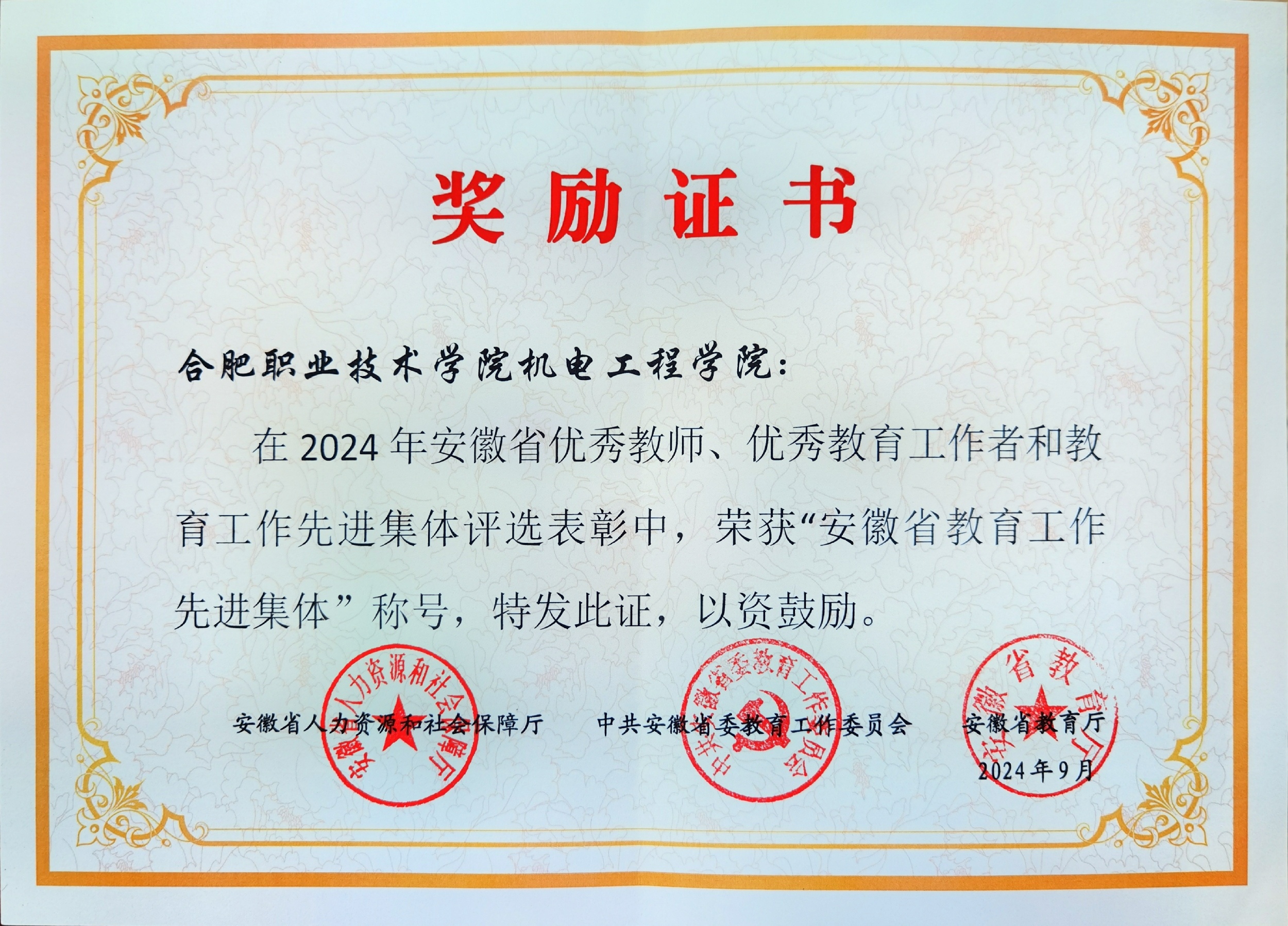 近日,安徽省人力资源和社会保障厅、中共安徽省委教育工委、安徽省教育厅发布了《关于表彰2024年安徽省优秀教师、优秀教育工作者和教育工作先进集体的决定》。买球体育官方网站凭借其在教育教学、产教融合及人才培养等多个领域取得的成就,荣获了2024年“安徽省教育工作先进集体”荣誉称号。