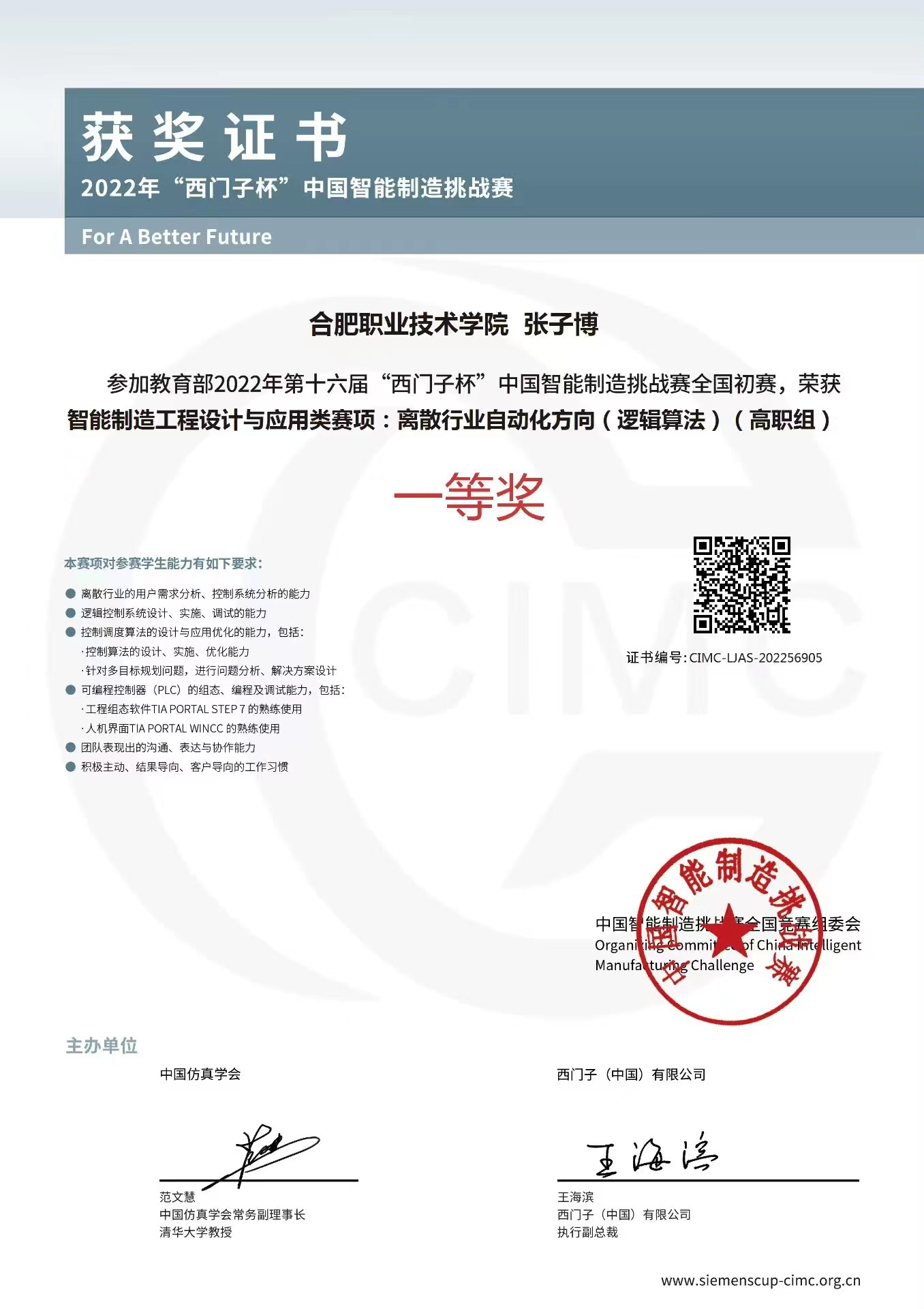 2022年9月3日-4日,第十六届“西门子杯”中国智能制造挑战赛华东三赛区暨全国初赛比赛顺利举行。买球体育买球体育官方网站张宇豪、张子博、宁骏等三位同学在胡经纬、张君继两位老师的共同指导下,获得离散行业自动化(逻辑算法)赛项全国初赛一等奖。