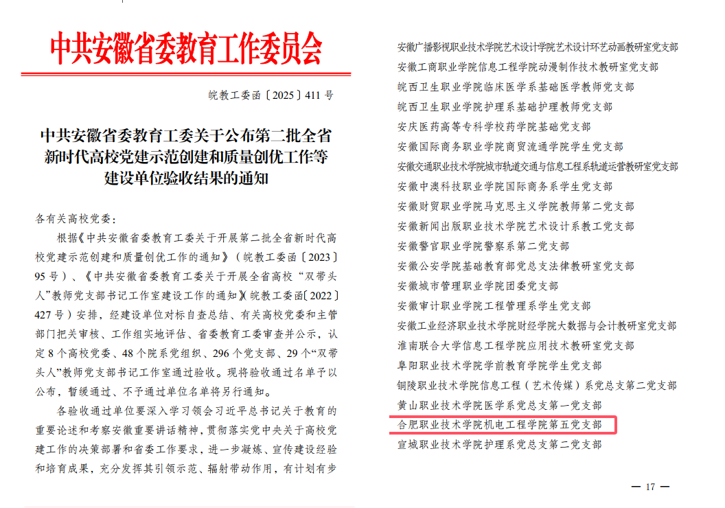 近日,根据《中共安徽省委教育工委关于公布第二批全省新时代高校党建示范创建和质量创优工作等建设单位验收结果的通知》,买球体育官方网站第五党支部顺利通过第二批“全省高校党建工作样板支部”验收。