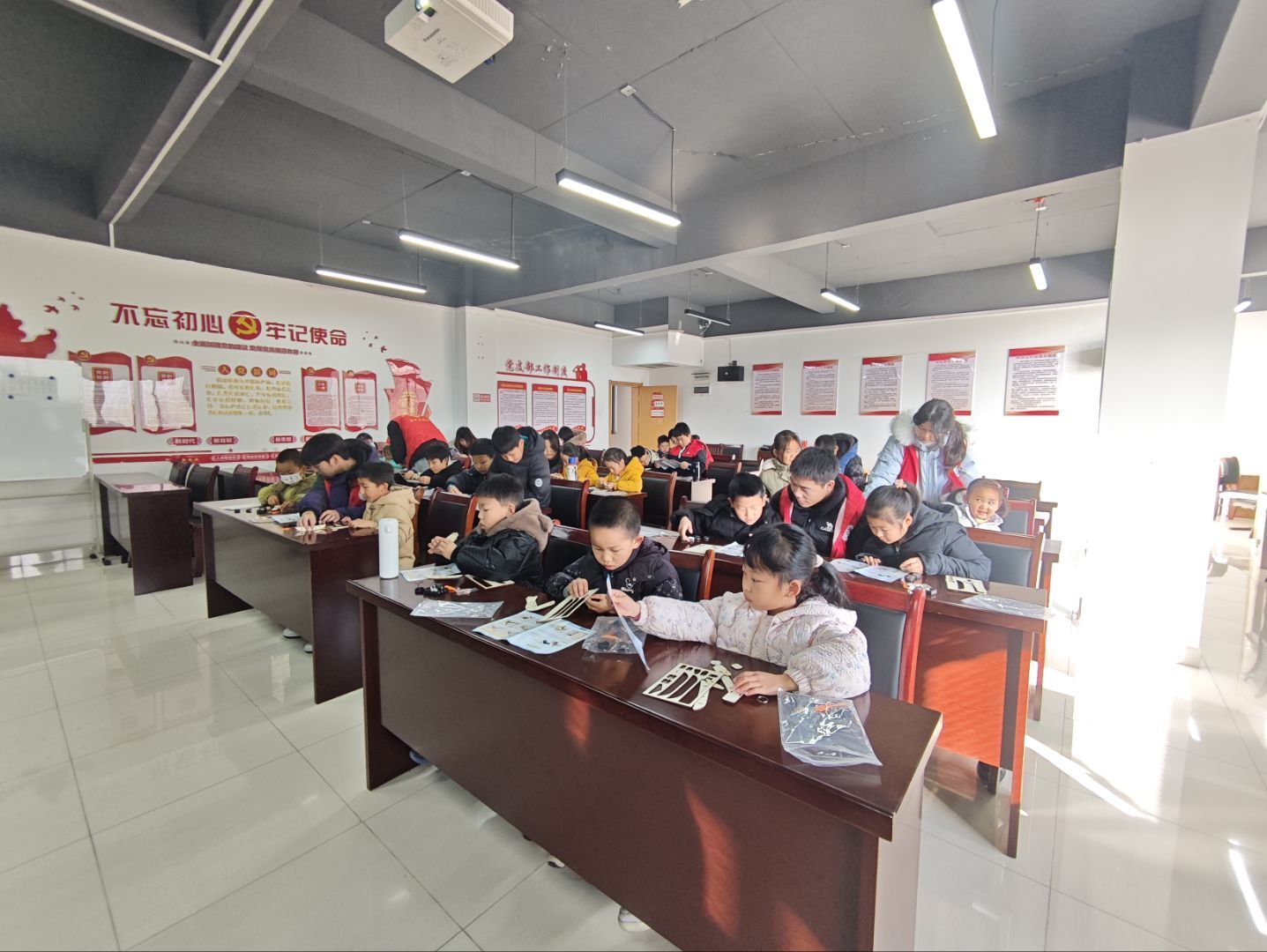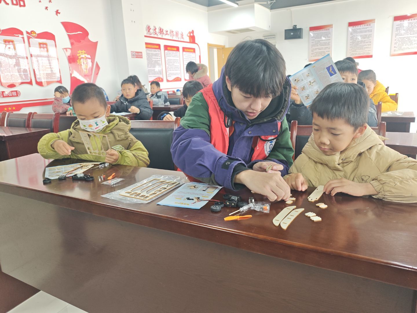 随后的航模组装环节,是活动最热闹的部分。志愿者将航模零件分发给孩子们,随即俯身耐心指导:有的蹲在孩子身旁演示零件拼接技巧,有的手把手协助调试组装细节,有的针对孩子的疑问逐一解答。孩子们或低头专注摸索零件拼接方式,或与小伙伴分工协作,在志愿者的帮助下,零散的材料包渐渐变成成型的航模作品,一张张稚嫩的脸上满是成就感。
