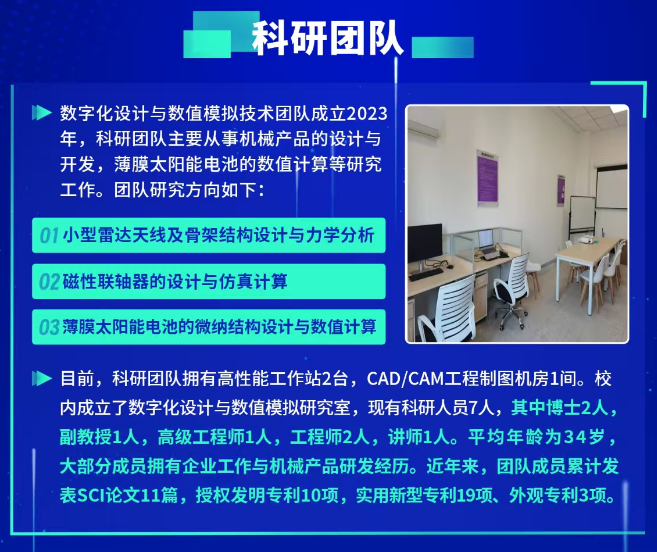 2022年底通过博士人才引进,吴睿成为买球体育买球体育官方网站的一名专任教师,从科研院所到职业院校,他秉持从零开始。在承担教学工作之外,积极探索思考“职业教育,需要什么样的科研?”。答案是职业教育需要以应用研究为核心、以解决实际问题为导向、产教深度融合的科研体系。2023年他成立了数字化设计与数值模拟技术团队,主要从事机械产品的设计与开发和薄膜光伏电池的技术研究。2023-2024年期间,先后主持买球体育官方网站人才项目1项、产学研项目1项、安徽省高校自然科学研究重点项目1项和企业横向课题4项,另外参与各类教科研项目10余项。吴睿在完成学校教学科研任务的同时,还积极投身企业博士后工作站的研究工作。通过博士后工作站搭建了校企合作的桥梁,成功签订了横向课题1项和申报省级质量工程校企合作生产性共建共享实训基地1项。在他的带领下,科研团队在两年内不断摸索和磨合,初见成效。