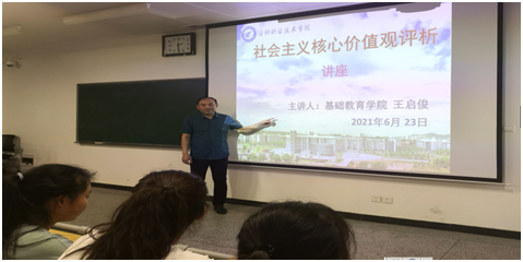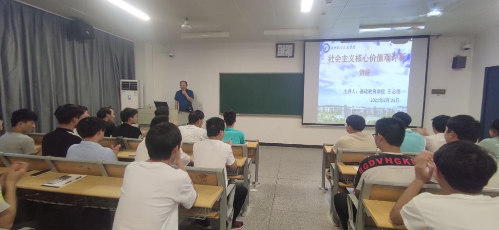 王启俊老师运用马克思主义理论,运用丰富典型的实例,对社会主义核心价值观国家、社会和个人层面内容作了细致的剖析,增强了大学生对中国特色社会主义的道路自信、理论自信、制度自信和文化自信的理解,弘扬了以爱国主义为核心的民族精神和以改革创新为核心的时代精神,让在座的学子如沐春风,如临秋水,受益匪浅。