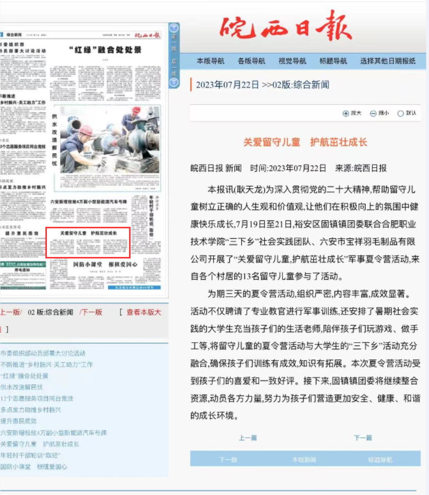 本次买球体育官方网站暑期社会实践成效显著,活动过程中受到皖西日报、裕安区共青团委等当地主流媒体的广泛关注和报道,引起社会良好的反响。团队成员们也受益匪浅,大家表示:这次实践旅程不仅是一场脚踏实地的“劳动课程”,也是一场提升自我的“人生课程”,更是一场学习贯彻习近平新时代中国特色社会主义思想和党的二十大精神的“必修课程”。
