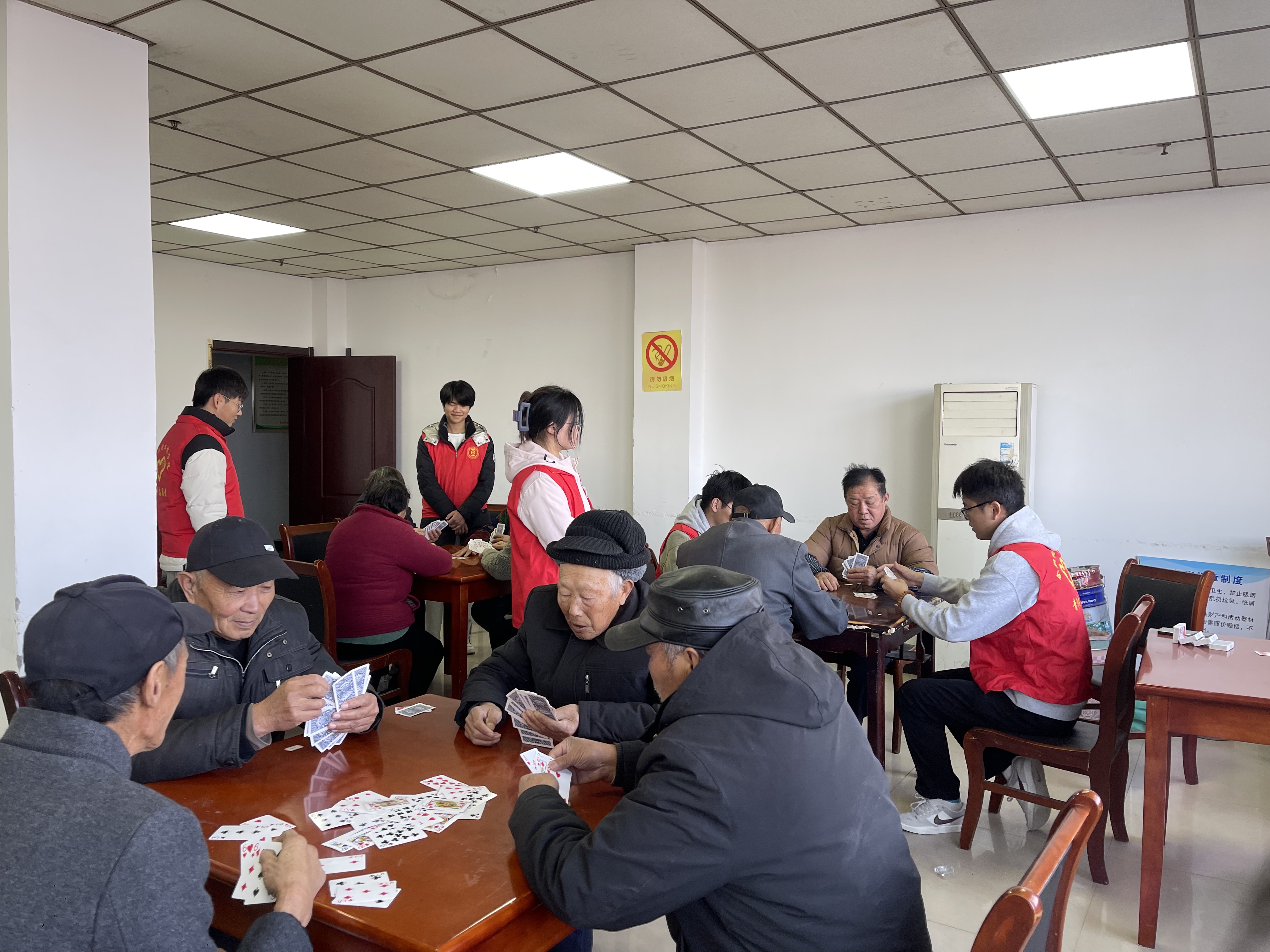 活动当天,志愿者们早早就来到校门口汇合,活动负责人倪家乐同学为每一位志愿者分配了具体任务,并详细介绍了活动内容和注意事项。活动过程中,志愿者们的到来,让平日里安静的社居委充满欢声笑语。志愿者们面带微笑,耐心地陪着老人畅聊生活琐事,认真倾听他们的故事与人生经历。在剪纸活动中更是一片其乐融融的景象,志愿者们小心翼翼地将剪刀和彩纸递到老人手中,轻声叮嘱:“爷爷奶奶,小心手哦。”老人的脸上洋溢着开心的笑容,手中的彩纸在剪刀下逐渐变成了漂亮的图案。在纸牌游戏活动中则充满了紧张和欢乐的氛围,老人们围坐在一起,志愿者们将纸牌洗好,轻轻地放在桌子中间。每当老人打出好牌,志愿者就会鼓掌欢呼:“爷爷,您真厉害,这牌出得太棒了!”