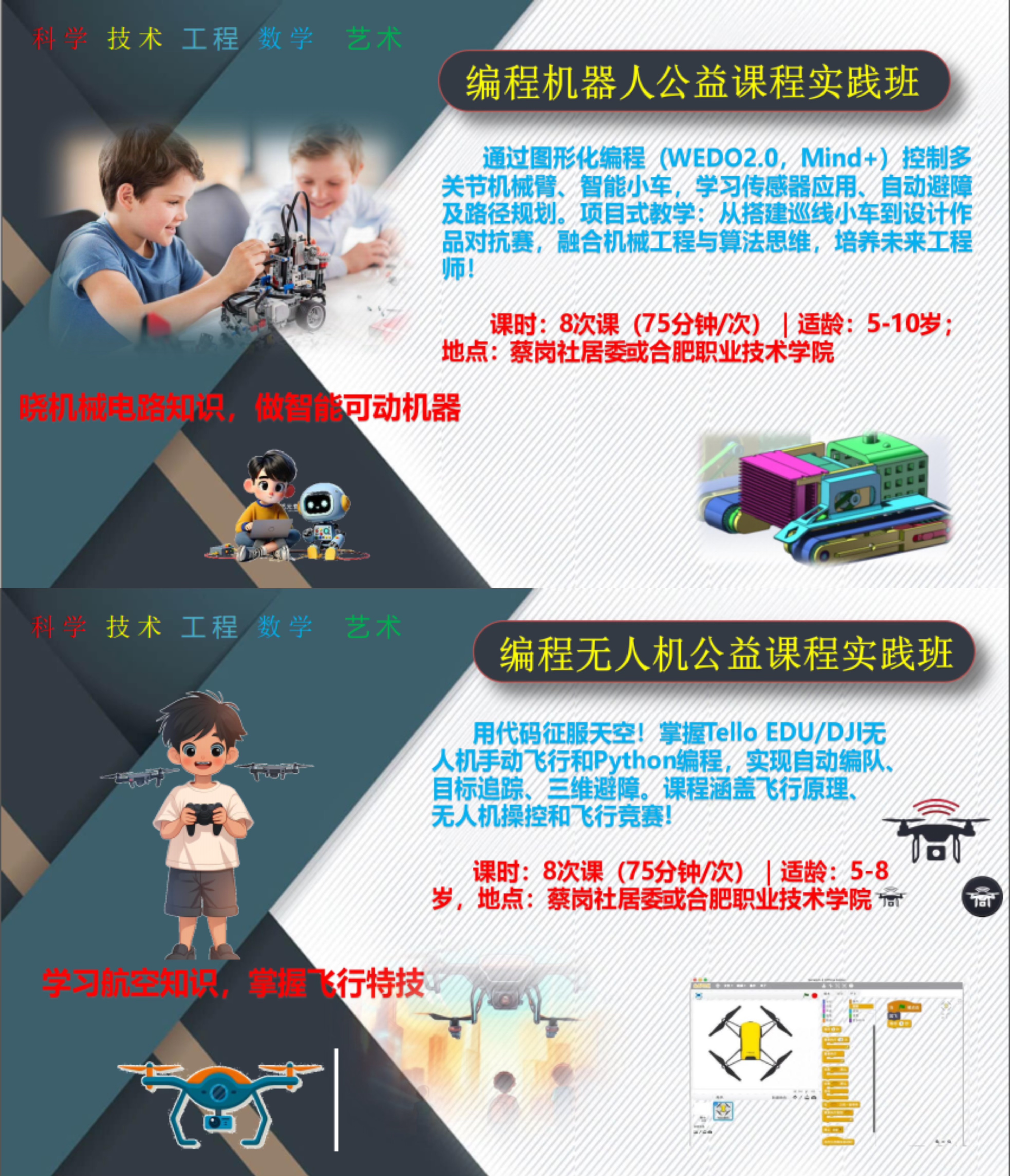 本次公益课程同时开设“编程机器人”与“编程无人机”两个实践班,每个班总计8课时教学。在编程机器人课程中,志愿者引导孩子们通过图形化编程工具控制多关节机械臂与智能小车,学习传感器应用、自动避障与路径规划等知识,并通过项目式教学方式,从搭建巡线小车到设计对抗赛作品,激发孩子们的工程思维与创新意识。编程无人机课程则带领孩子们探索飞行原理,学习无人机的手动操控与Python编程,实现自动编队、目标追踪与三维避障等功能,在动手实践中感受航空科技的魅力。